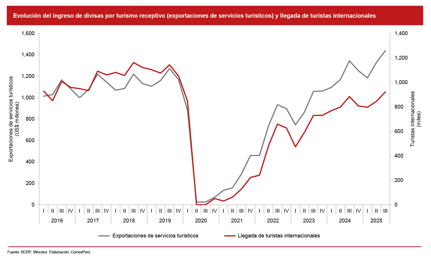 Las exportaciones de servicios consolidan su crecimiento luego la caída asociada a la pandemia. El ingreso de divisas por turismo receptivo, que representó el 68.2% del valor total exportado al tercer trimestre de 2025, muestra una marcada recuperación y crecimiento. Si bien la actividad turística es importante, no se deben dejar de lado los otros rubros. Los de comunicaciones y seguros y reaseguros tienen potencial para continuar creciendo. La inversión en ellos será determinante en los próximos años para una consolidación absoluta de las exportaciones de servicios.