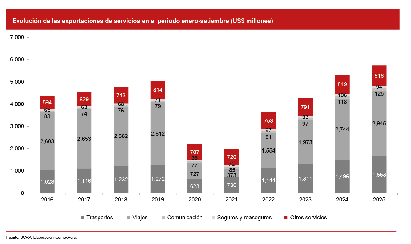 Las exportaciones de servicios alcanzaron los US$ 5,743 millones entre enero y setiembre de 2025, un 8.1% más que en el mismo periodo de 2024 y un 13.8% por encima de enero-setiembre de 2019. En el acumulado hasta setiembre, los servicios de transporte crecieron un 11.2% respecto del año pasado; los de seguros y reaseguros, en cambio, cayeron un 11.3%.