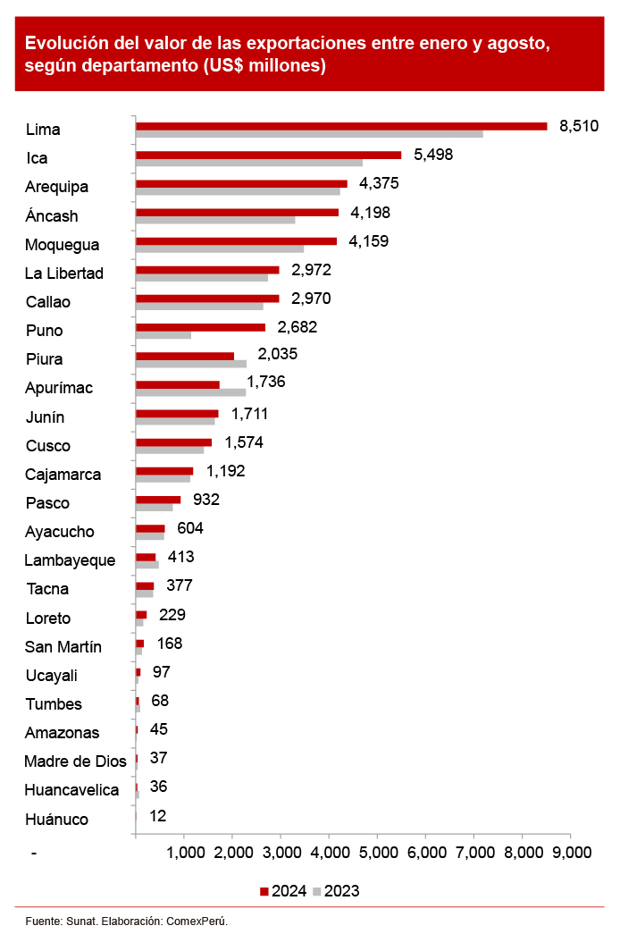 EXPORTACIONES DEPARTAMENTALES: DINAMISMO EN ENERO-AGOSTO 2024