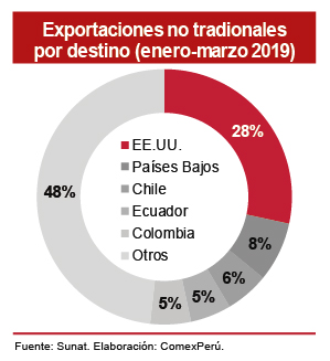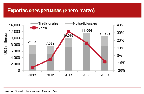 Hacia marzo de este año, las exportaciones peruanas sumaron US$ 10,753 millones, lo que supuso una caída del 8% respecto del mismo periodo en 2018. Dicho resultado obedece, principalmente, al retroceso de las exportaciones tradicionales (-11.8%), particularmente de las mineras, debido a menores niveles de producción por la paralización temporal y el agotamiento de las reservas en algunas minas. Por el contrario, las exportaciones no tradicionales se mantuvieron en terreno positivo (+2.5%), con un dinamismo sustentado en los mayores envíos de sectores estratégicos como el agroexportador.