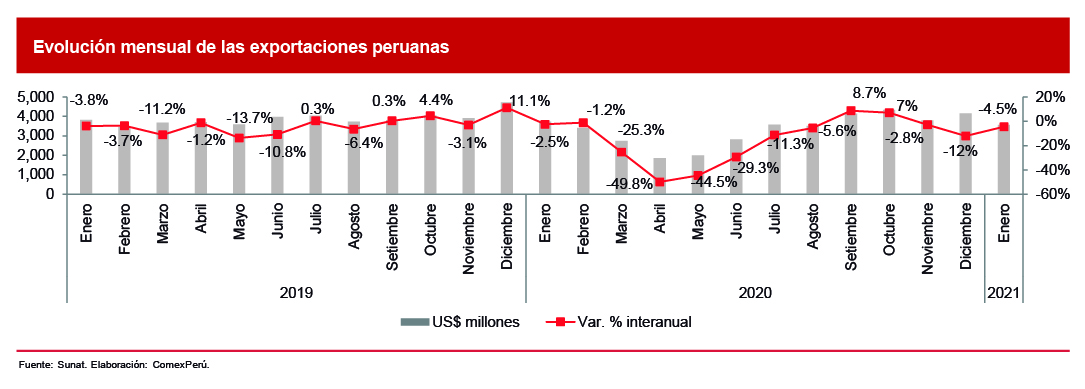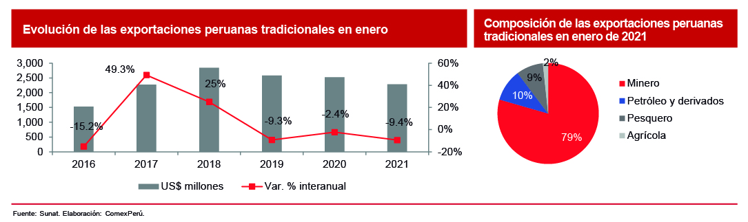 Con la reactivación de la economía internacional, la contracción de nuestras exportaciones se está desacelerando; sin embargo, los resultados aún no reflejan su recuperación. Así, en enero de 2021, se registraron envíos nacionales por un total de US$ 3,561 millones, cifra que representa una variación interanual negativa del -4.5%, debido a las menores exportaciones mineras tradicionales (-14.9%) y de petróleo y derivados (-1.9%), principalmente.