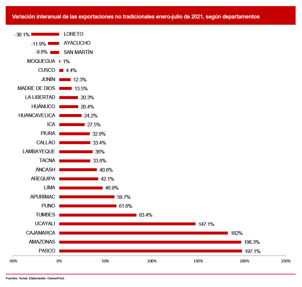 Como se observa en el gráfico, los departamentos que registraron un mayor crecimiento de sus exportaciones no tradicionales en el periodo enero-julio 2021 fueron Pasco (US$ 75.7 millones, +197.1%), Amazonas (US$ 0.6 millones, +196.3%) y Cajamarca (US$ 19.9 millones, +182%), mientras que los que presentaron un retroceso fueron San Martín (US$ 51.3 millones, -9.6%), Loreto (US$ 2.8 millones, -30.1%) y Ayacucho (US$ 23.3 millones, -11.9%)