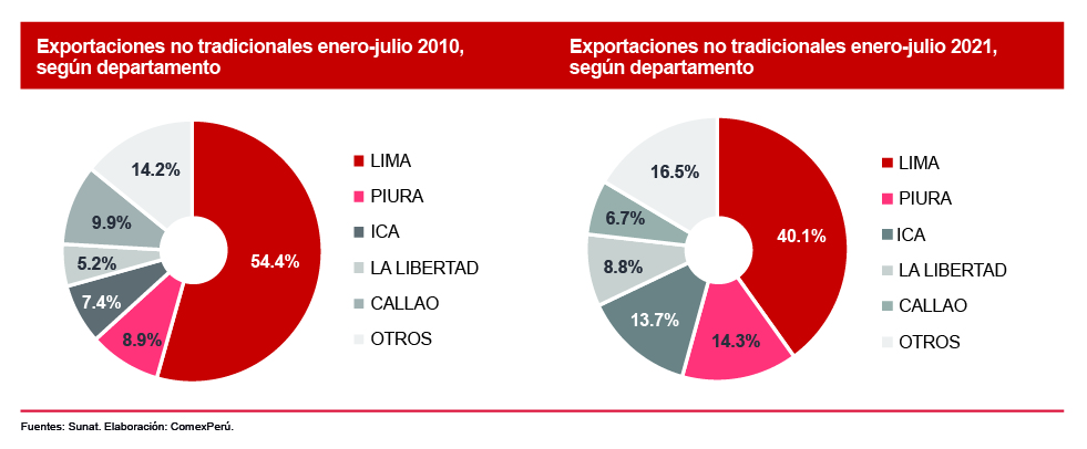 Este análisis es interesante pues, si bien los departamentos con mayores exportaciones no tradicionales fueron Lima, Piura e Ica, se observa cómo las exportaciones de este tipo de otros departamentos, como los mencionados, vienen alcanzado dinamismo, lo cual aporta muchísimo para un desarrollo descentralizado.