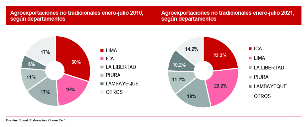 Asimismo, si efectuamos un análisis de las agroexportaciones no tradicionales, Lima también ha cedido terreno e, incluso, ha sido superado por Ica. Como se aprecia en los gráficos, la participación de Ica en las agroexportaciones no tradicionales pasó del 19% al 23.3%, mientras que Lima pasó del 30% al 23.3%, en el periodo enero-julio de 2010/2021.