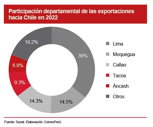 En lo que respecta a los departamentos que lideraron las exportaciones a Chile en 2022, Lima se posiciona en el primer lugar, con envíos por US$ 710 millones (+1%). En segundo lugar, está Moquegua, con US$ 285 millones (+38%). Cierran el top 5 Callao, con envíos por US$ 281 millones (+48.2%), Tacna (US$ 184 millones, -19.7%) y Áncash (US$ 134 millones, +53.2%). Estos orígenes concentran el 80.8% de las exportaciones totales hacia el país vecino del sur.