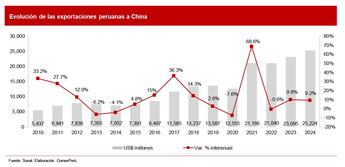 EXPORTACIONES PERUANAS A CHINA SUMARON US$ 25,224 MILLONES EN 2024