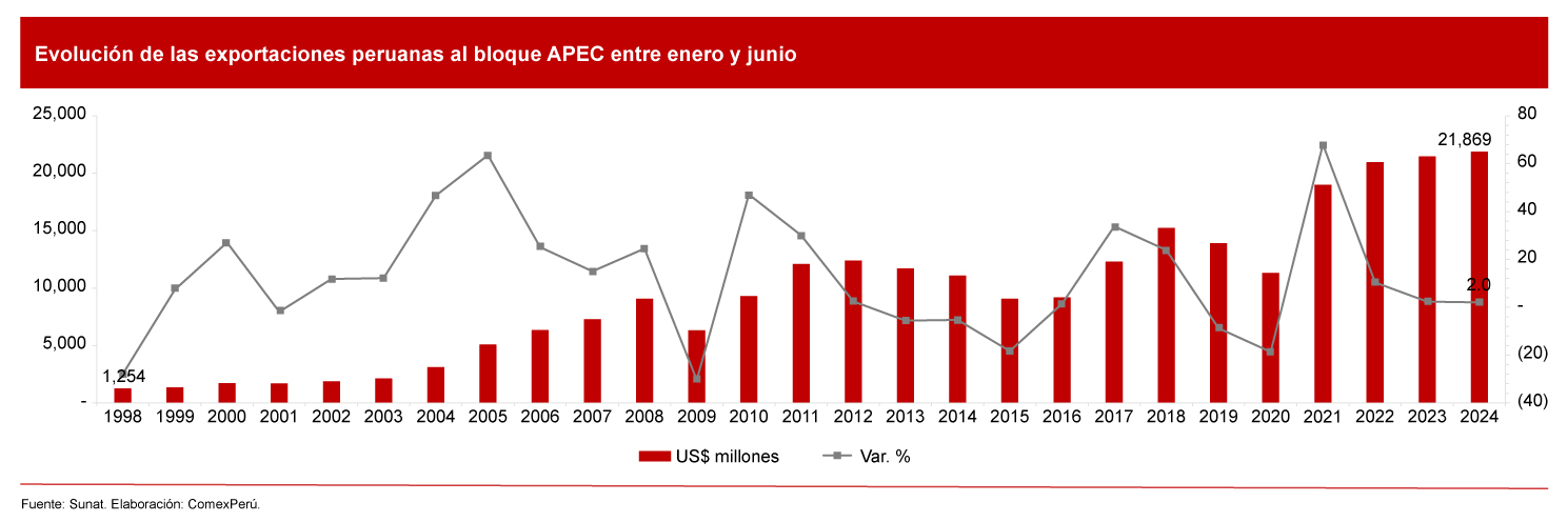 Desde su incorporación al APEC, en 1998, el Perú ha experimentado un notable crecimiento en su intercambio comercial con el bloque. Las exportaciones se han multiplicado por 14.7 y las importaciones, por 7.5. En 2023, el comercio con las economías de este bloque representó el 66.7% del valor total de nuestras transacciones internacionales, y el 68.5% de nuestras exportaciones se dirigieron a ellas, al totalizar US$ 44,252 millones (+4% interanual).
