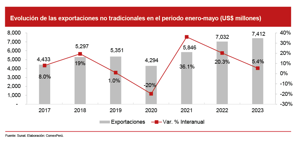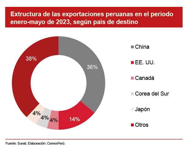 Los diferentes problemas que enfrentó nuestro país en los primeros meses del año —conflictos sociales y eventos climáticos— afectaron el dinamismo exportador, el cual a la fecha es difícil de recuperar. Con miras a superar lo logrado en 2022, es importante recuperar la paz social y el trabajo preventivo por los efectos que causará el fenómeno de El Niño en nuestro país; de esa forma aseguraremos que nuestros envíos al exterior no se vean afectados considerablemente en lo que resta del año.