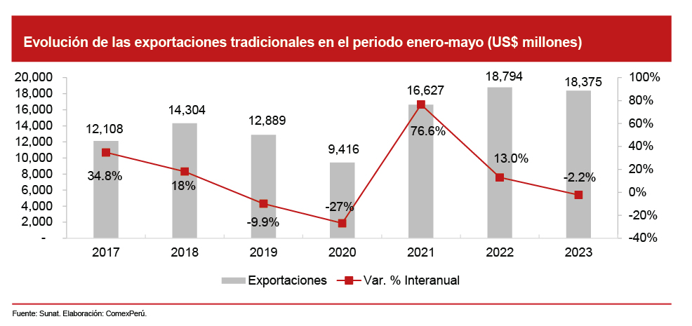 Entre enero y mayo de 2023, las exportaciones tradicionales alcanzaron un valor de US$ 18,375 millones, lo que reflejó una disminución del 2.2% con respecto al mismo periodo del año anterior. Al respecto, las exportaciones mineras lideraron los envíos del rubro con un valor de US$ 15,416 millones y un crecimiento del 6.9%, seguido por las exportaciones de petróleo y derivados (US$ 1,978 millones, -34.6%), las pesqueras tradicionales: harina y aceite de pescado (US$ 826 millones, -14.5%), y las agrícolas: café, azúcar y algodón (US$ 155 millones, -60.3%). Sin embargo, cabe destacar que las exportaciones mineras han presentado crecimientos consecutivos en los últimos tres meses de 2023 con respecto a los mismos meses del año anterior: en marzo aumentaron un 32.7%; en abril, un 17.3%, y en mayo, un 23.6%.