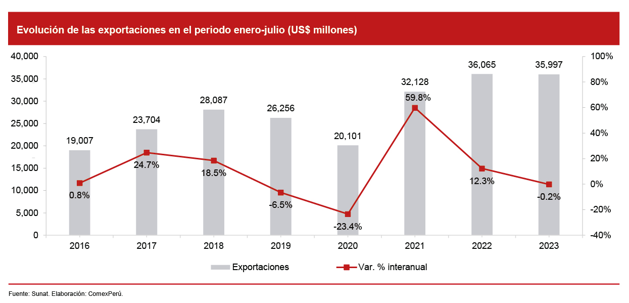 De acuerdo con cifras de la Sunat, durante el periodo enero-julio de 2023, las exportaciones totales sumaron US$ 35,997 millones, lo que evidenció una caída del 0.2% en comparación con el mismo periodo de 2022. En desagregado, el resultado se explica por la caída de los envíos tradicionales (-0.6%) y el incremento de los no tradicionales (+0.9%), teniendo en cuenta que los primeros representan el 72.2% del total exportado.