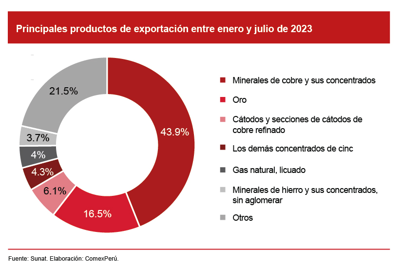 Los principales productos exportados del rubro tradicional fueron los minerales de cobre y sus concentrados, con envíos por US$ 11,422 millones, un 22.9% más que el en mismo periodo de 2022. Les siguen el oro (US$ 4,292 millones, -2%), los cátodos y secciones de cátodos de cobre refinado (US$ 1,583 millones, +10.3%), los demás concentrados de cinc (US$ 1,110 millones, -13.3%), el gas natural licuado (US$ 1,050 millones, -51.2%) y los minerales de hierro y sus concentrados sin aglomerar (US$ 957 millones, -12%). Solo los dos primeros sumaron US$ 15,715 millones y constituyeron el 43.7% del total exportado al mundo, lo cual evidencia su relevancia dentro del rubro y del total de nuestras exportaciones.
