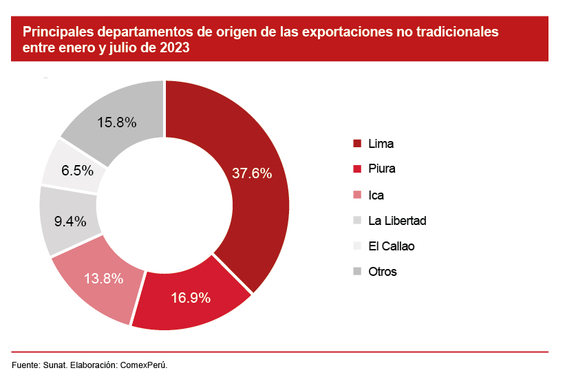 Entre enero y julio de 2023, los principales departamentos de origen de las exportaciones no tradicionales fueron Lima, con US$ 3,756 millones y una contracción de 6.5%, seguido por Piura (US$ 1,686 millones, +27,1%), Ica (US$ 1,380 millones, +8.4%), La Libertad (US$ 945 millones, +8.7%) y el Callao (US$ 656 millones, -15.6%). En relación con la participación sobre el total de exportaciones no tradicionales, los departamentos del interior del país suman un 62.4%.