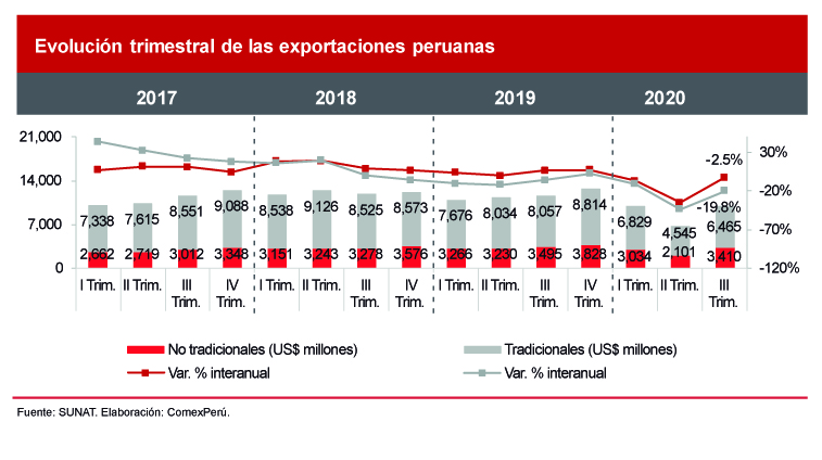 Por otro lado, en cuanto al rubro no tradicional, los envíos también presentaron tasas negativas en el periodo acumulado enero-setiembre de 2020, como es el caso del sector químico (-12.7%), el pesquero (-28.3%), el textil (-33.5%) y el siderometalúrgico (-32.2%). Igualmente, otros sectores de menor participación también presentaron tasas negativas, como el metalmecánico (-25.6%), la minería no metálica (-32.9%) y las maderas y papeles (-29%), Así, solo el sector agropecuario registró un ligero desempeño positivo (2.8%). Si bien en el agregado esta recuperación del sector agroexportador puede parecer solo una recuperación modesta, está altamente influenciado por un incremento del 15.3% en el mes de setiembre, lo cual refuerza la importancia de la agricultura industrial y el valor agregado que el sector genera en favor de miles de familias peruanas.