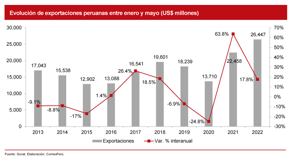 De acuerdo con cifras de la Sunat, las exportaciones totales entre enero y mayo de 2022 registraron un valor de US$ 26,447 millones. Esta cantidad representa un crecimiento del 17.8% con respecto al mismo periodo del año pasado. Cabe destacar que, del total de envíos, aquellos tradicionales son los que explican el resultado, pues representaron un 73.1% del valor total exportado, mientras que la diferencia (26.9%) corresponde a los envíos no tradicionales. Asimismo, estos registraron un incremento del 16.4% y el 21.7%, respectivamente.