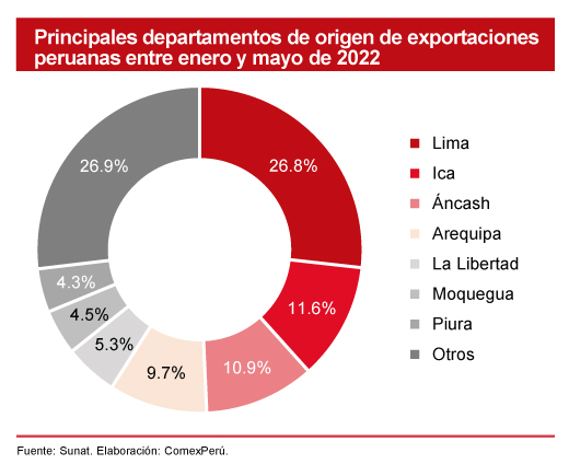 Al analizar los principales departamentos de origen de nuestras exportaciones, Lima lidera la lista con un total de US$ 7,078 millones enviados entre enero y mayo de 2022. Dicho monto es un 59.5% más que lo registrado en el periodo similar de 2021. Le siguen los departamentos de Ica (US$ 3,066 millones; +18.4%), Áncash (US$ 2,894 millones; +9.8%), Arequipa (US$ 2,576 millones; +30.2%), La Libertad (US$ 1,390 millones; +13.1%), Moquegua (US$ 1,188 millones; +13.2%) y Piura (US$ 1,145 millones; +8%).