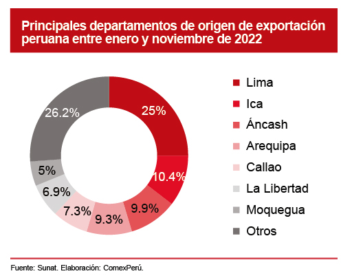 Al analizar los principales departamentos de origen de nuestras exportaciones, Lima tiene el mayor valor exportado, con un total de US$ 14,353 millones entre los meses de enero y noviembre de 2022. Dicho monto es un 24.4% más que lo registrado en el mismo periodo de 2021. Le siguen los departamentos de Ica (US$ 5,990 millones; -0.1%), Áncash (US$ 5,673 millones; -4%), Arequipa (US$ 5,309 millones; +9.7%), Callao (US$ 4,205 millones, +12.6%) y La Libertad (US$ 3,967 millones, 13.2%).
