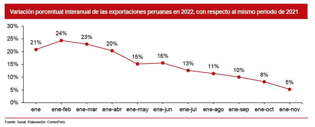 De acuerdo con cifras de la Sunat, en el periodo enero-noviembre de 2022, las exportaciones mineras alcanzaron un valor de US$ 31,878 millones, lo que representa un retroceso del 6.4% en comparación con el mismo periodo del año previo. En lo que respecta al mes de noviembre, los envíos mineros disminuyeron un 27.5% con relación al mismo mes de 2021. La caída de estos, durante el periodo de análisis se debe a los menores envíos de hierro (-26.2%), plomo (-21.9%), cobre (-9.5%) y oro (-4.6%).