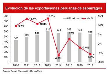 En nuestro país, este producto es muy importante para el comercio exterior. Así, en 2017, sus exportaciones representaron un 4.7% del total de envíos no tradicionales y un 10.7% de los del sector agropecuario. Asimismo, los espárragos frescos o refrigerados fueron el tercer producto no tradicional agropecuario exportado en 2017, solo por detrás de las uvas frescas y las paltas. Además, según el ITC, en 2016, el Perú fue el segundo exportador mundial de espárragos frescos o refrigerados, solo por detrás de México.