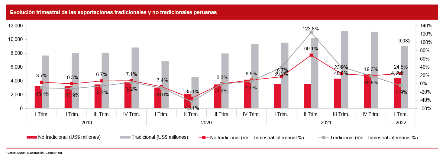 En cuanto a las exportaciones peruanas, su dinamismo en el primer trimestre de 2022 se explica, principalmente, por el crecimiento de las exportaciones no tradicionales. Estos envíos, que se caracterizan por su mayor valor agregado, sumaron un total de US$ 4,396 millones, un 24.5% más en comparación con el primer trimestre de 2021. Cabe destacar que este valor constituye un récord histórico en términos del desempeño al primer trimestre del año y es un monto solo superado por los valores de los últimos dos trimestres del año 2021. Estos resultados son indicadores sólidos de que la competitividad exportadora peruana mantiene una sólida recuperación e invitan a pensar que, a finales de 2022, se pueda superar la valla histórica alcanzada en envíos de este tipo durante 2021.