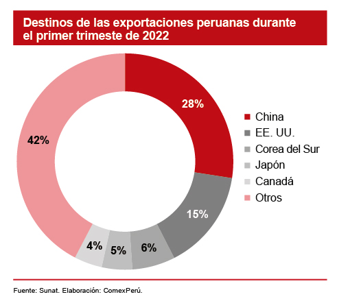 Entre los principales socios comerciales del Perú, los países que ocuparon los cinco primeros puestos en envíos durante el primer trimestre de 2022 fueron China (US$ 3,701 millones), EE. UU. (US$ 2,026 millones), Corea del Sur (US$ 865 millones), Japón (US$ 614 millones) y Canadá (US$ 565 millones). Estos destinos engloban el 58% de la canasta exportadora peruana en el periodo de análisis.
