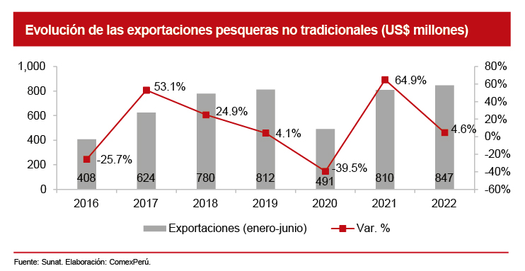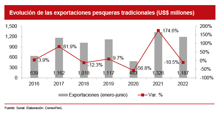 A nivel desagregado, las exportaciones pesqueras tradicionales y no tradicionales fueron US$ 1,187 millones (-10.5%) y US$ 847 millones (+4.6%), respectivamente. Entre los productos tradicionales, se exportaron US$ 968 millones en harina de pescado y US$ 219 millones en aceite de pescado, con lo que se evidenció una caída del 7.3% y el 22.2%, respectivamente, en comparación con el mismo periodo de 2021. En esa línea, entre los productos no tradicionales, destacaron las exportaciones de productos congelados (US$ 174 millones; -18.3%); hígados, huevas y lechas (US$ 75 millones; +68.3%); moluscos (US$ 55 millones; -41.6%) y atunes (US$ 16 millones; -6.7%).