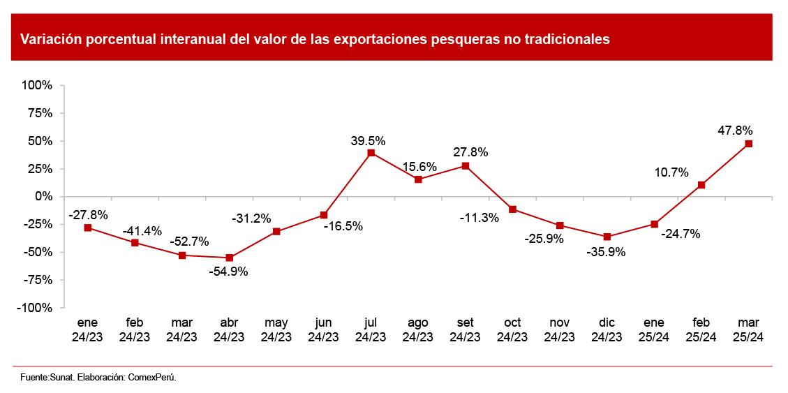 Durante 2024, los envíos pesqueros no tradicionales registraron una caída del 25.2%. Solo tres meses del año (julio, agosto y setiembre) alcanzaron tasas de crecimiento, mientras que los restantes reflejaron descensos interanuales que fluctuaron entre el 11% y el 54%.