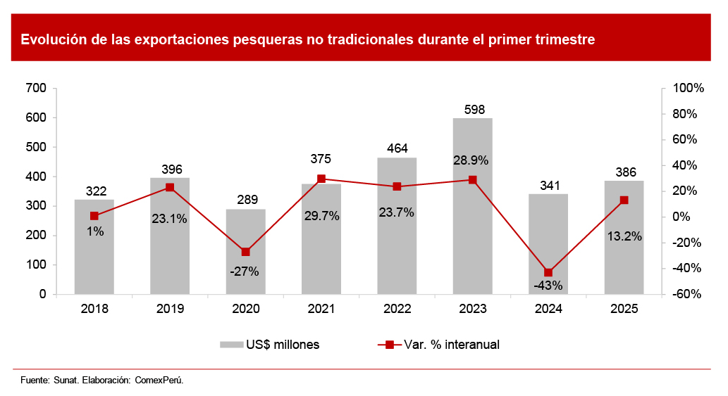 Las exportaciones pesqueras no tradicionales sumaron US$ 386 millones durante el primer trimestre de 2025, lo que representa un crecimiento del 13.2% en comparación con el mismo periodo de 2024. Este resultado se interpreta principalmente como una recuperación, luego de los adversos primeros meses de 2024, debido a los efectos del cambio climático.