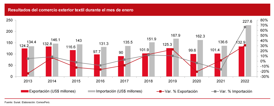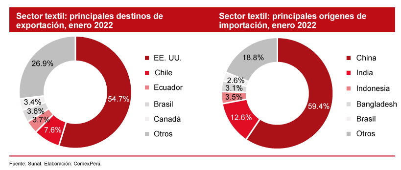 De acuerdo con cifras de la Sunat, durante enero de 2022, las exportaciones textiles peruanas alcanzaron un valor de US$ 132.9 millones, lo que equivale a un 31.1% más en comparación con el mismo mes de 2021 y un 33.3% más con respecto a enero de 2020. Esta cifra de exportación al inicio del año marca un récord histórico en términos de valor exportado. Los principales destinos de exportación de nuestros textiles durante enero de 2022 fueron EE. UU., con envíos por US$ 72.7 millones, lo que representa un 54.7% del monto total exportado; seguido de Chile (US$ 10.2 millones, 7.6%), Ecuador (US$ 5 millones, 3.7%), Brasil (US$ 4.8 millones, 3.6%) y Canadá (US$ 3.5 millones, 3.4%).