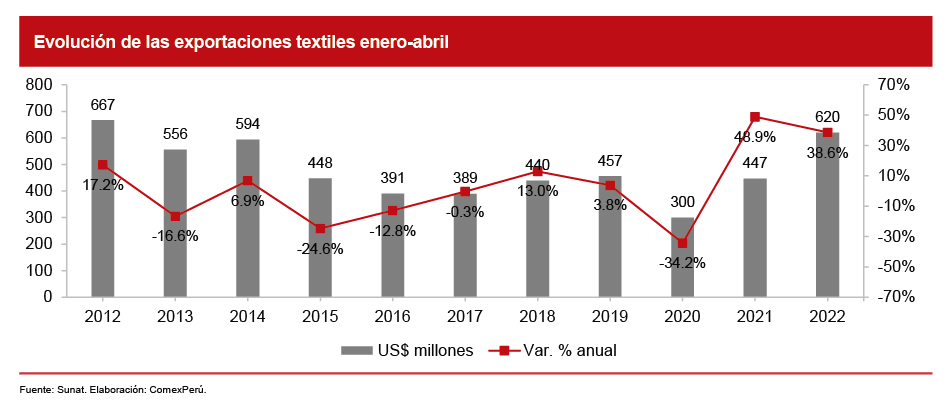 Las exportaciones del sector textil entre enero y abril del presente año ascendieron a US$ 620 millones, según cifras de la Sunat. Estas crecieron un 38.6% con respecto al mismo periodo del año previo e, inclusive, superaron vastamente los niveles prepandemia (US$ 456 entre enero y abril de 2019). Cabe mencionar también que representaron un 11% de las ventas del rubro no tradicional en el periodo de estudio.