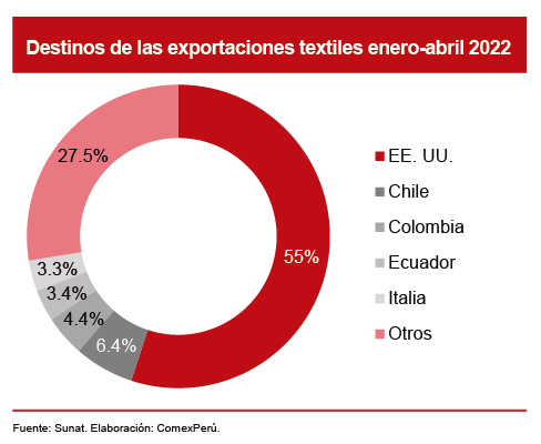 En cuanto a los destinos de las exportaciones del sector, EE. UU. se posicionó como el principal, tras realizar compras por US$ 341 millones entre enero y abril de 2022, un 43.3% más que en el mismo periodo de 2021, lo que representó el 55% del total de nuestros envíos del sector textil al mundo. Chile se posicionó como nuestro segundo mayor comprador, al que realizamos envíos por US$ 39 millones, un 54.9% más que en el mismo periodo del año pasado, y que representaron un 6.4% de los envíos del sector.
