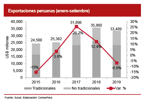 De acuerdo con cifras de la Sunat, entre enero y setiembre de 2019, las exportaciones peruanas sumaron un total de US$ 33,489 millones, lo que reflejó una caída del 6.6% con respecto al mismo periodo de 2018. Las exportaciones tradicionales representaron el 70.3% de nuestros envíos al mundo y retrocedieron un 10.2% en comparación con el mismo periodo del año anterior, mientras que las no tradicionales concentraron el 29.7% y aumentaron un 3%.