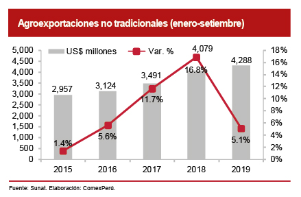 Las exportaciones no tradicionales han tenido un mejor desempeño que las tradicionales este año. Entre los envíos que destacan se encuentran las agroexportaciones, que sumaron un total de US$ 4,288 millones, lo que significó un incremento del 5.1% con respecto al periodo enero-setiembre del año anterior. Si bien la evolución de este sector mantiene una tendencia positiva en los últimos 5 años, el crecimiento alcanzado en 2019 estuvo por debajo del registrado para el mismo periodo de 2018 (+16.8%).