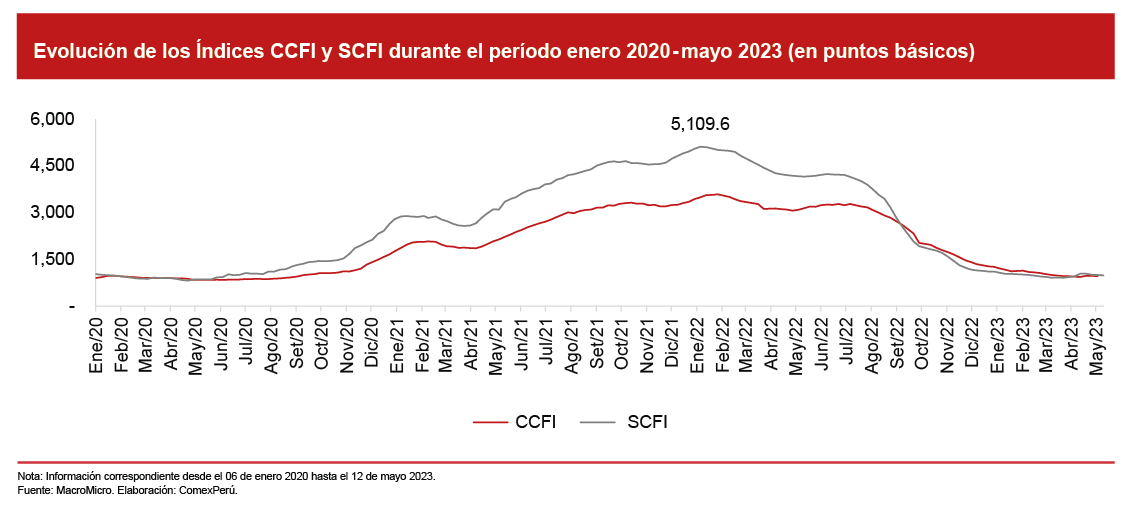 Esa tendencia continuó durante el primer trimestre de este año y se reflejó en una caída continua de los fletes marítimos, que se situaron cerca de los niveles prepandemia. Los últimos registros de marzo de 2023, correspondiente a los Índices SCFI (923.8 puntos básicos) y WCI (US$ 1,717 x contenedor de 40 pies), registraban un decrecimiento, respecto de inicios de 2023, del 12.9% y el 19.6%, respectivamente.