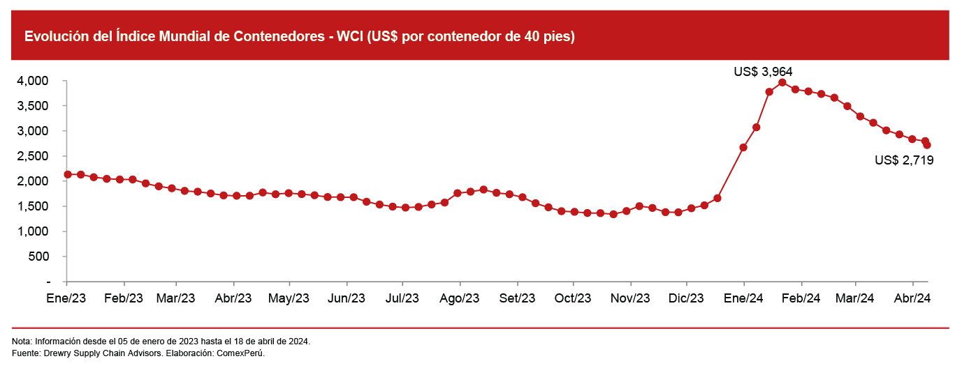Desde el pico registrado en enero, los fletes marítimos han disminuido gradualmente hasta alcanzar un valor promedio de US$ 2,719/FEU al 18 de abril último, lo que representa una reducción del 31.4% desde principios de año, pero un aumento del 53.3% en comparación con la misma semana del año anterior.
