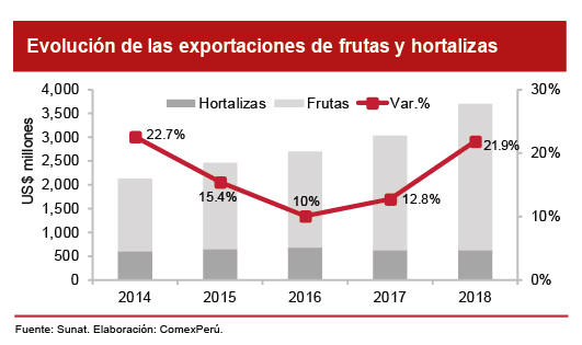 De acuerdo con cifras de la Sunat, en 2018, las exportaciones peruanas de frutas y hortalizas frescas (comprendidas en los capítulos 7 y 8 del arancel nacional) sumaron un total de US$ 3,713 millones, lo que reflejó un crecimiento del 21.9% con respecto a 2017. Asimismo, en los últimos cinco años, nuestros envíos de estos productos registraron un crecimiento promedio anual del 16.5%. Su desempeño viene siendo liderado por las exportaciones de uvas, que alcanzaron un total de US$ 818 millones (+27%), seguidas por las paltas, con US$ 548 millones (+48%).