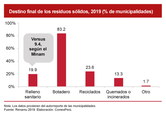 [2] El universo para este cálculo fue de 1,809 municipalidades informantes del Renamu, de las 1,874 existentes en el país. Vale aclarar que, si bien un 19.9% de las municipalidades del país reporta emplear rellenos sanitarios, puede existir sobreestimación por parte de las mismas al tratarse de un autorreporte, además de que el Minam no los considera como tales.