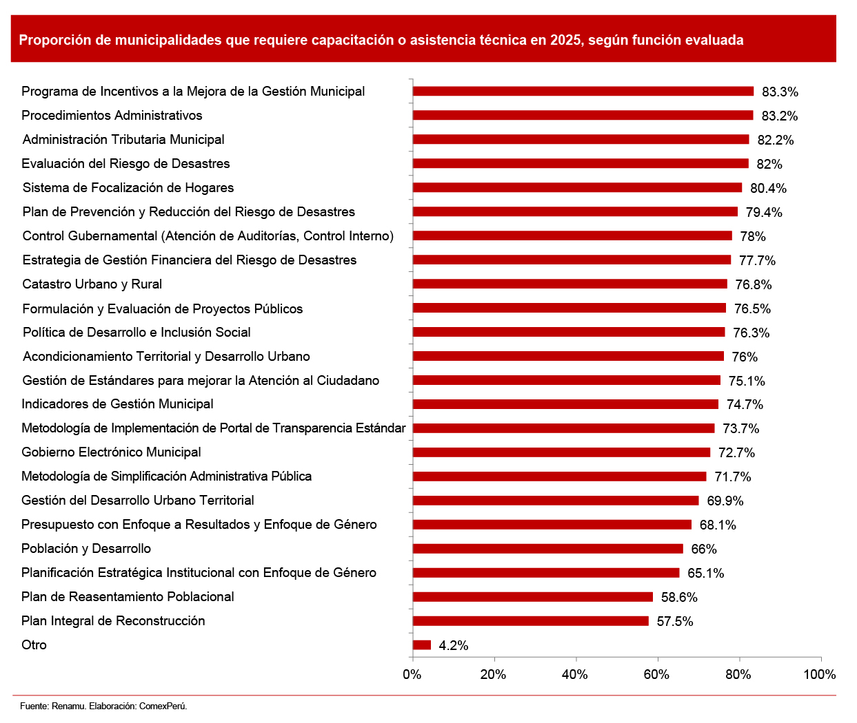 De acuerdo con el Registro Nacional de Municipalidades (Renamu), 1,829 de las 1,891 comunas existentes a nivel nacional reportaron requerir capacitación o asistencia técnica para desarrollar de manera adecuada sus funciones. En ocho regiones, todas las municipalidades necesitan apoyo del Gobierno nacional en al menos una función. Entre las temáticas más urgentes destacan, debido a su relevancia, la gestión de procedimientos administrativos, la evaluación de riesgos de desastres y la administración tributaria municipal.