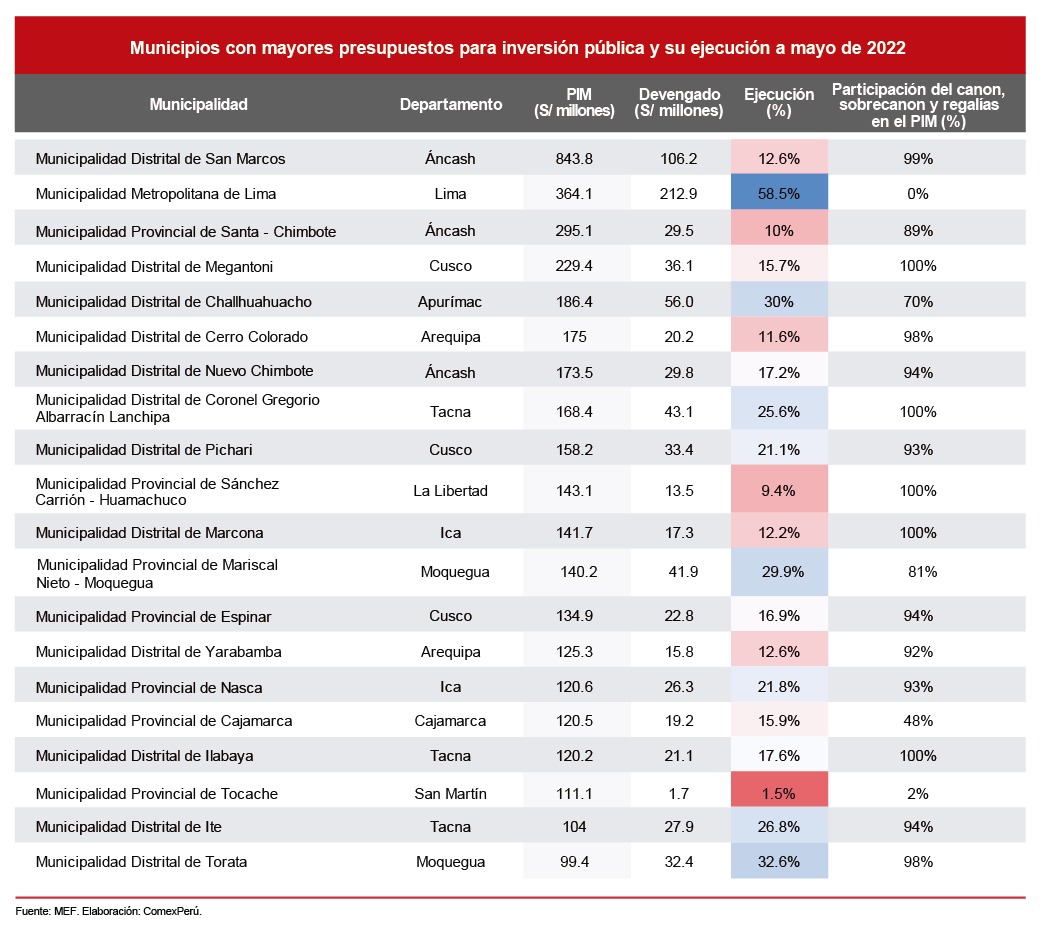 Además, es importante conocer que, de los 20 municipios con mayor presupuesto institucional modificado (PIM) para inversión pública a nivel nacional, en 14 de ellos el rubro de canon, sobrecanon y regalías explica más del 90% de los recursos, por lo que se consolida como la principal fuente de financiamiento para las obras públicas en dichos distritos. Pese a ello, muchos de estos municipios evidencian bajos niveles de ejecución presupuestal.