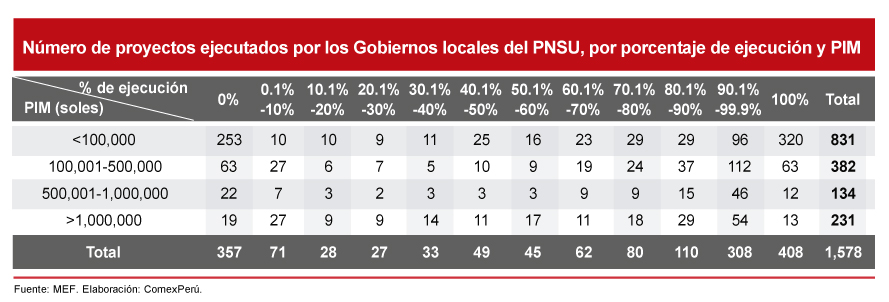 A su vez, un porcentaje no despreciable de proyectos parece quedar “atrapado” en una ejecución, a lo mucho, del 10%. De regreso a los proyectos con PIM mayor a S/ 1 millón, estas proporciones son del 20% del total, en el caso del PNSU, y el 14.6%, en el caso del PNSR. En cambio, aproximadamente más de un tercio de los proyectos con PIM menor a los S/ 100,000 se ejecutaron por completo en ambos programas.