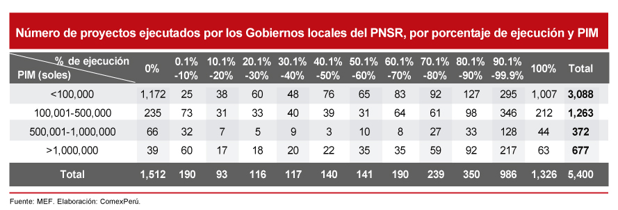 Las conclusiones de estos datos son variadas. Por un lado, es claro que en los Gobiernos locales predominan los proyectos de menor presupuesto y, al parecer, pueden ejecutarse al 100% de lo planeado para el año de forma más sencilla. Por otro lado, una gran parte de estos proyectos son abandonados. Esto es especialmente notorio en el caso del PNSR pues, entre todos los subgrupos mostrados, el de menor PIM y ejecución cero es el más grande. Cuando consideramos los proyectos de mayor tamaño, en cambio, es difícil llegar al 100% de la ejecución, si bien un buen grupo se encuentra cerca de ese porcentaje.