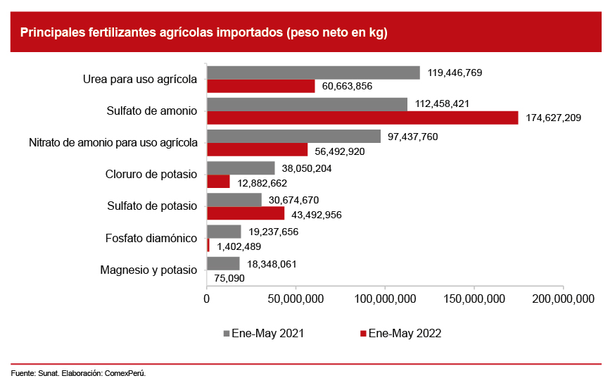 De acuerdo con el Ministerio de Comercio Exterior y Turismo (Mincetur), en el primer trimestre de 2022, las importaciones de fertilizantes cayeron un 53%, debido a los altos precios en el mercado internacional. Así, el volumen de las importaciones de principales fertilizantes hasta mayo de 2022 ha sufrido una reducción para casi todos estos insumos. Tan solo se han incrementado las importaciones de sulfato de amonio y sulfato de potasio. Estas reducciones estarían ocasionando un déficit que pondría en riesgo la campaña agrícola 2022-2023, que se inicia en agosto próximo.