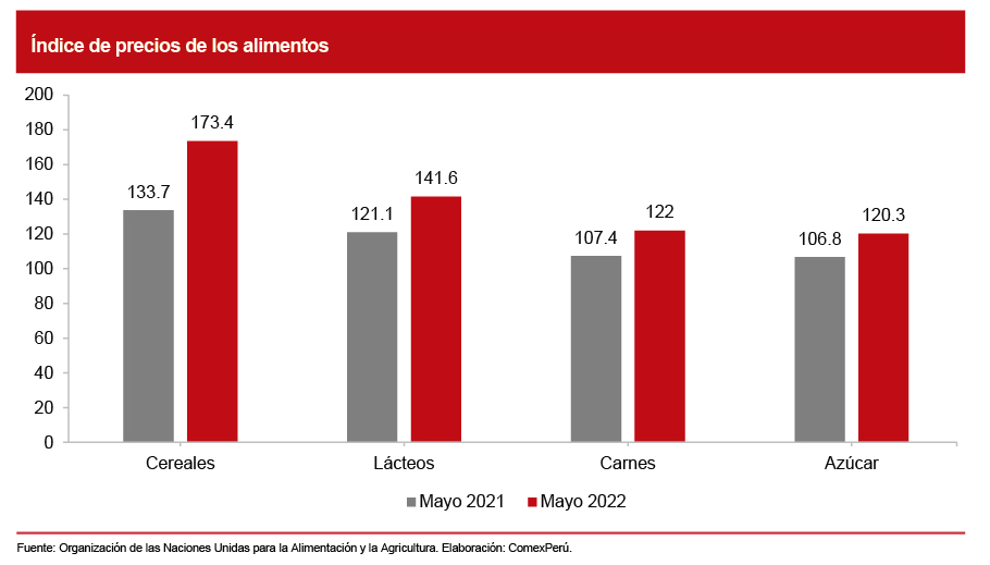 Según informó la Organización de las Naciones Unidas para la Alimentación y Agricultura (FAO, por sus siglas en inglés), el índice global de precios de los alimentos que ellos calculan se situó en un valor de 157.4 en mayo del presente año, 22.8 puntos porcentuales por encima de lo que se hallaba en mayo del año pasado. En cuanto a los índices por grupo alimentario, los aceites y los cereales son aquellos productos cuyos precios más se han incrementado entre mayo del presente año y el mismo mes de 2021.