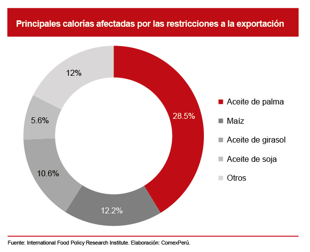 Por otro lado, el International Food Policy Research Institute (IFPRI) ha dado a conocer que se han impuesto restricciones a la exportación de ciertos productos, las cuales están afectando el 17% de las calorías comercializadas en el mundo. Como ya se conoce, Rusia y Ucrania no están exportando cereales; a ellos se sumó la India, que cerró sus exportaciones de trigo. Otros proveedores notables que imponen restricciones a las exportaciones son Indonesia (prohibición de las exportaciones de aceite de palma) y Argentina (prohibición de las exportaciones de carne de vacuno), así como Turquía, Kirguistán y Kazajstán (prohibiciones de diversos productos de grano). El IFPRI, asimismo, señaló que son cinco productos agrícolas que representan casi el 90% de las calorías importadas que son actualmente afectadas por las restricciones a la exportación.