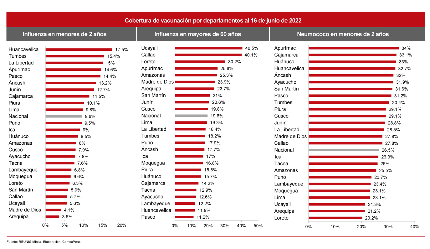 Este rezago se evidencia también en el avance de la vacunación de influenza (refuerzo) en niños menores de 2 años que, al 16 de junio, alcanza solo el 9.6% a nivel nacional, según datos del Repositorio Único Nacional de Información en Salud (REUNIS). Los departamentos con menor cobertura son Arequipa (3.6%), Madre de Dios (4.1%), Ucayali (5.6%) y el Callao (5.7%). Por su parte, la inmunización de influenza en mayores de 60 años es del 19.6%, con solo dos departamentos que superan el 40%: Ucayali y el Callao. Finalmente, al avance de la vacunación contra el neumococo en niños menores a 2 años no supera siquiera el 30%.