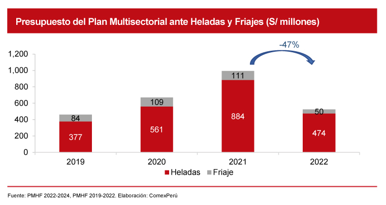 Ahora, un factor determinante al analizar el actualizado plan de heladas y friajes es el del presupuesto. Para 2022, se tiene previsto destinar S/ 524 millones, de los cuales S/ 474 millones (90%) se destinarán a atender las zonas de riesgo ante heladas y S/ 50 millones (10%) para las comunidades más vulnerables a los friajes. No obstante, este valor resulta muy inferior a los presupuestos actualizados previstos para años anteriores. Solo para 2021 se habían considerado S/ 995 millones.
