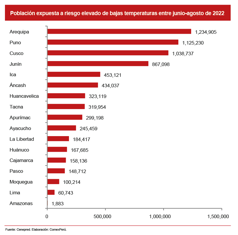 Puno fue el segundo departamento más afectado en 2022, con un total de 1,125,230 personas expuestas a riesgo elevado frente a bajas temperaturas, aunque en 2021 encabezaba la lista con una cantidad similar de población en riesgo. En este departamento, el problema de heladas y friajes es más recurrente. Lo mismo ocurre en el Cusco, que el año pasado registró 1,038,737 personas en riesgo elevado por bajas temperaturas durante junio-agosto, cifra que también se asemeja a la observada el año previo.