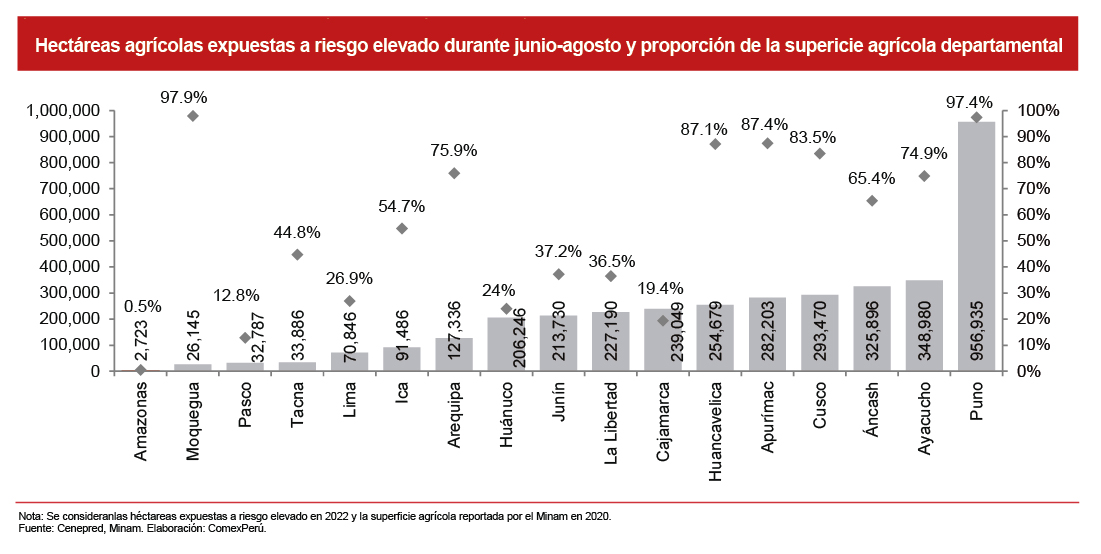 Esta situación se agrava en Puno, donde se registraron 956,935 hectáreas agrícolas expuestas a riesgo elevado durante junio-agosto de 2022, de acuerdo con estimaciones del Cenepred. Sin embargo, si consideramos que la superficie agrícola reportada por el Ministerio del Ambiente (Minam) ascendió a 982,833 hectáreas en 2020, la proporción de hectáreas expuestas a riesgo elevado representa el 97.4% del total de este departamento.