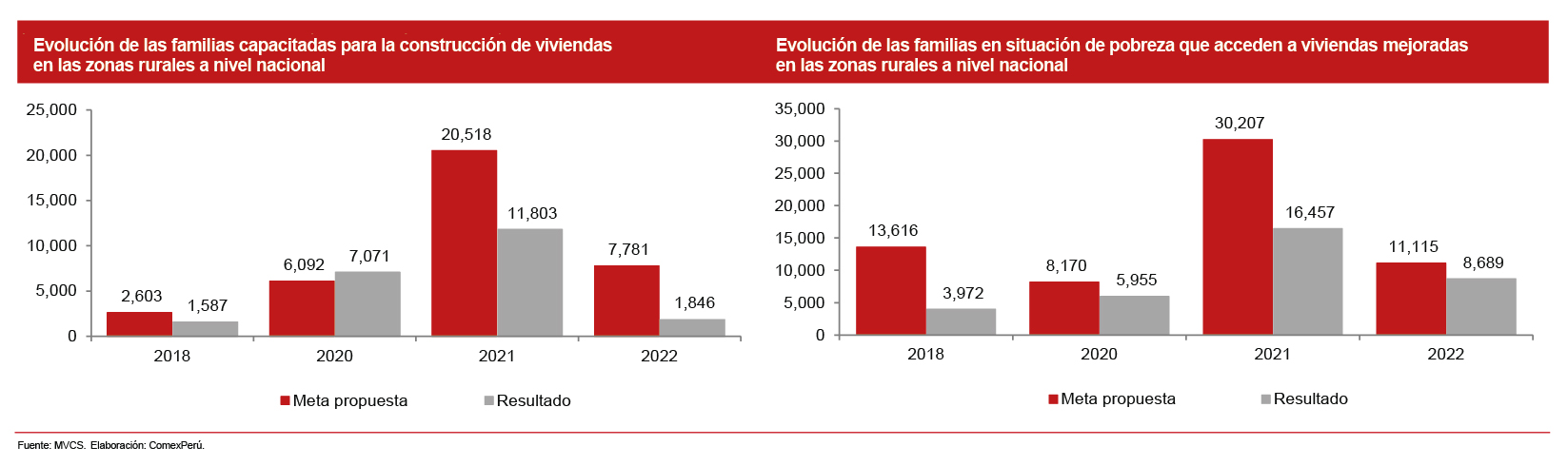 Al respecto, es importante enfatizar que la proporción de familias rurales en condición de pobreza que cuentan con una vivienda adecuada a nivel nacional aumentó significativamente en los últimos años tras incrementarse del 13.1% al 44.6% entre 2018 y 2022. Si bien esto es positivo, es importante destacar que la mayor velocidad en el progreso de dicho indicador responde a que se fortaleció el PMHF en 2019, pero también que el resultado del año pasado se situó por debajo de las expectativas del Ministerio de Vivienda, Construcción y Saneamiento (MVCS), que proyectaba un 59.2%.