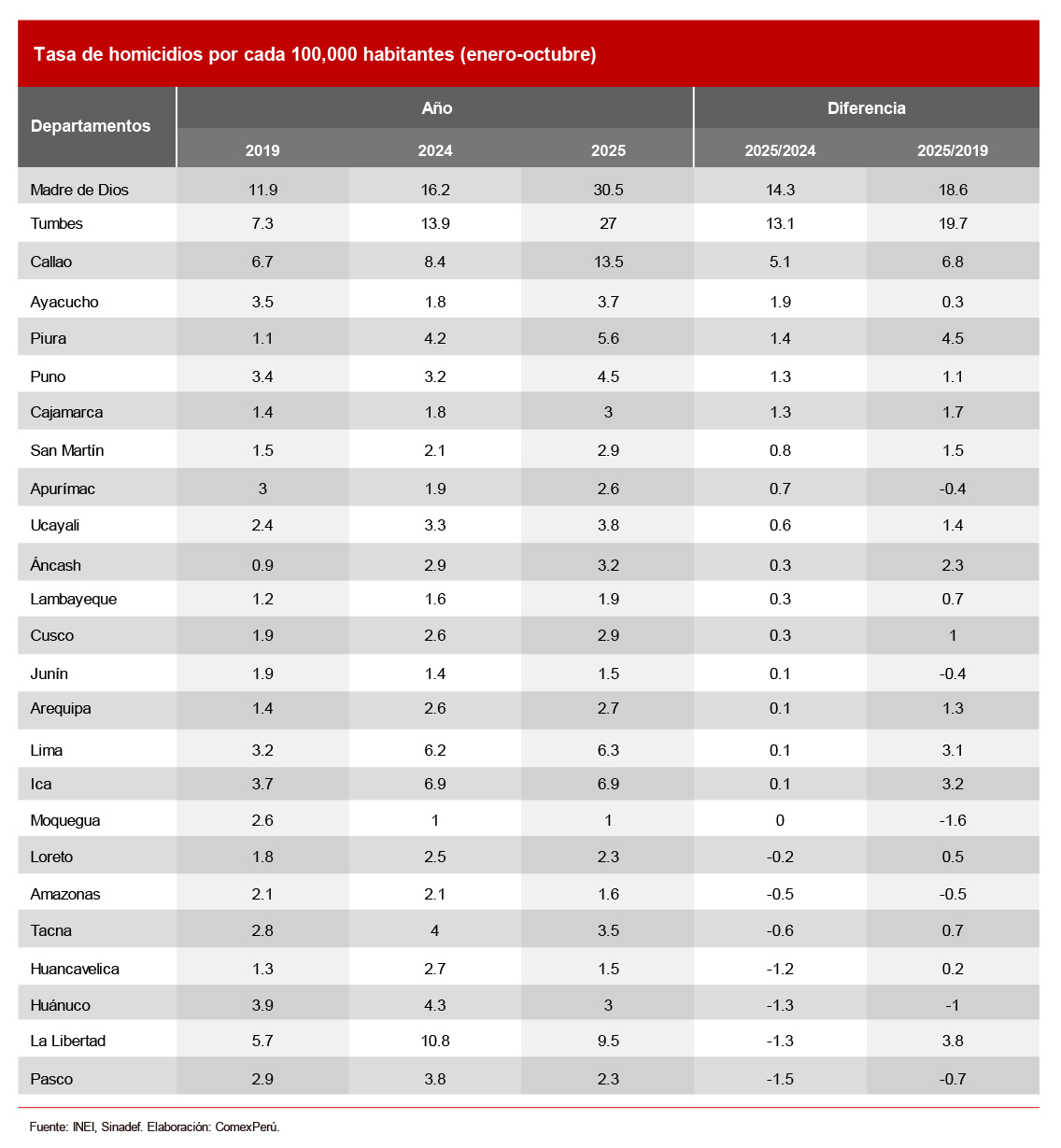 Si analizamos la información por departamentos, para el periodo enero-octubre, en 17 departamentos y el Callao, la tasa de homicidios por cada 100,000 habitantes crece respecto de 2024. Los departamentos con los mayores aumentos fueron Madre de Dios, con 30.5 homicidios por cada 100,000 habitantes (+14.3 respecto a 2024); Tumbes, con 27 (+13.1), y la provincia del Callao, con 13.5 (+5.1).