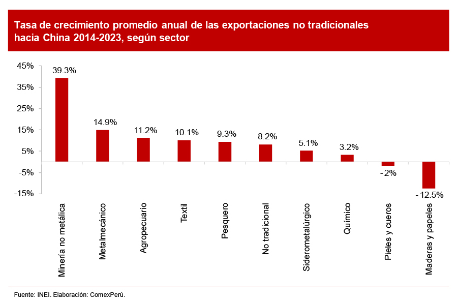 El sector exportador no tradicional experimentaría una expansión gracias a la incorporación de nuevos productos agropecuarios, tras establecerse su protocolo fitosanitario. Estos serían las pecanas, castañas y frutas congeladas, incluyendo la palta, el mango y los arándanos. Cabe mencionar que el crecimiento promedio anual del rubro agropecuario fue del 17% entre 2014 y 2023. Este desempeño muestra una gran capacidad de expansión, lo cual hace que los acuerdos comerciales sean particularmente beneficiosos para este sector.